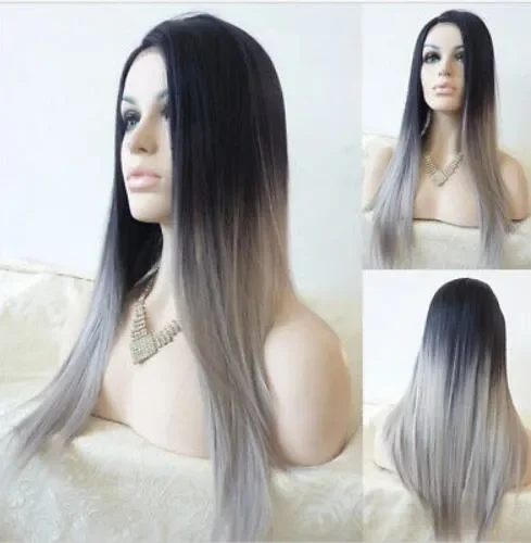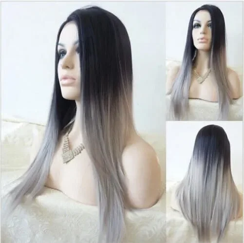 Women's Ombre Long Black Mixed Grey Straight Full Wig Heat Resistant Cosplay Party Hair Wigs