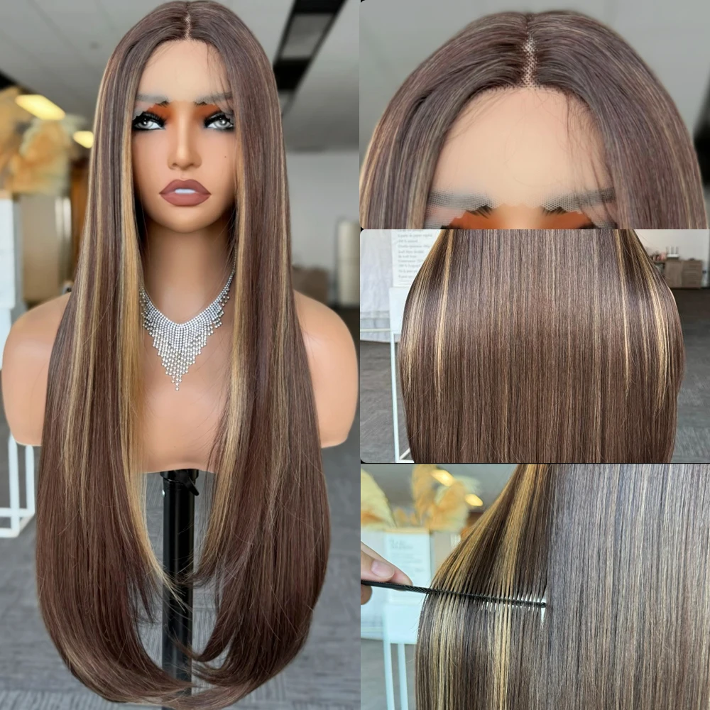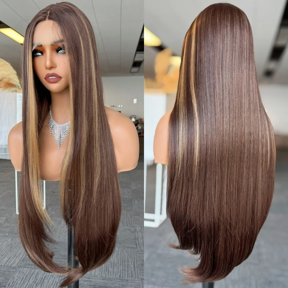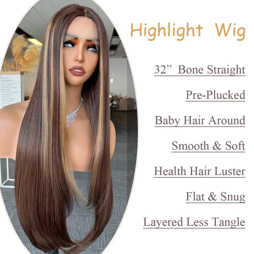 X-TRESS Highlight Brown Synthetic Lace Front Wig Pre Plucked 32Inch Long Straight Synthetic Wig with Baby Hair for Women Fashion